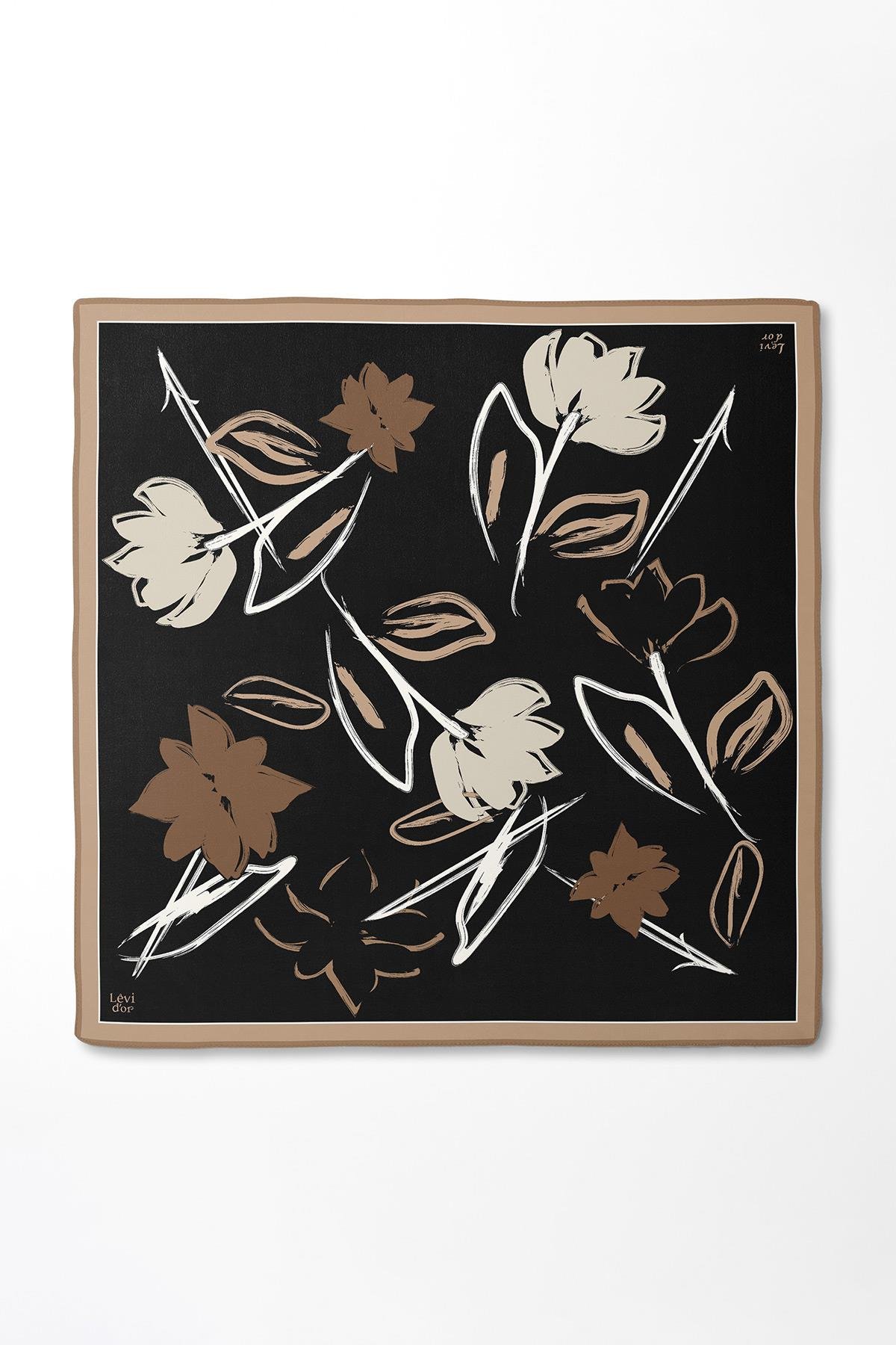LevidorA.Kahve Çiçek Desen Twill İpek Eşarp