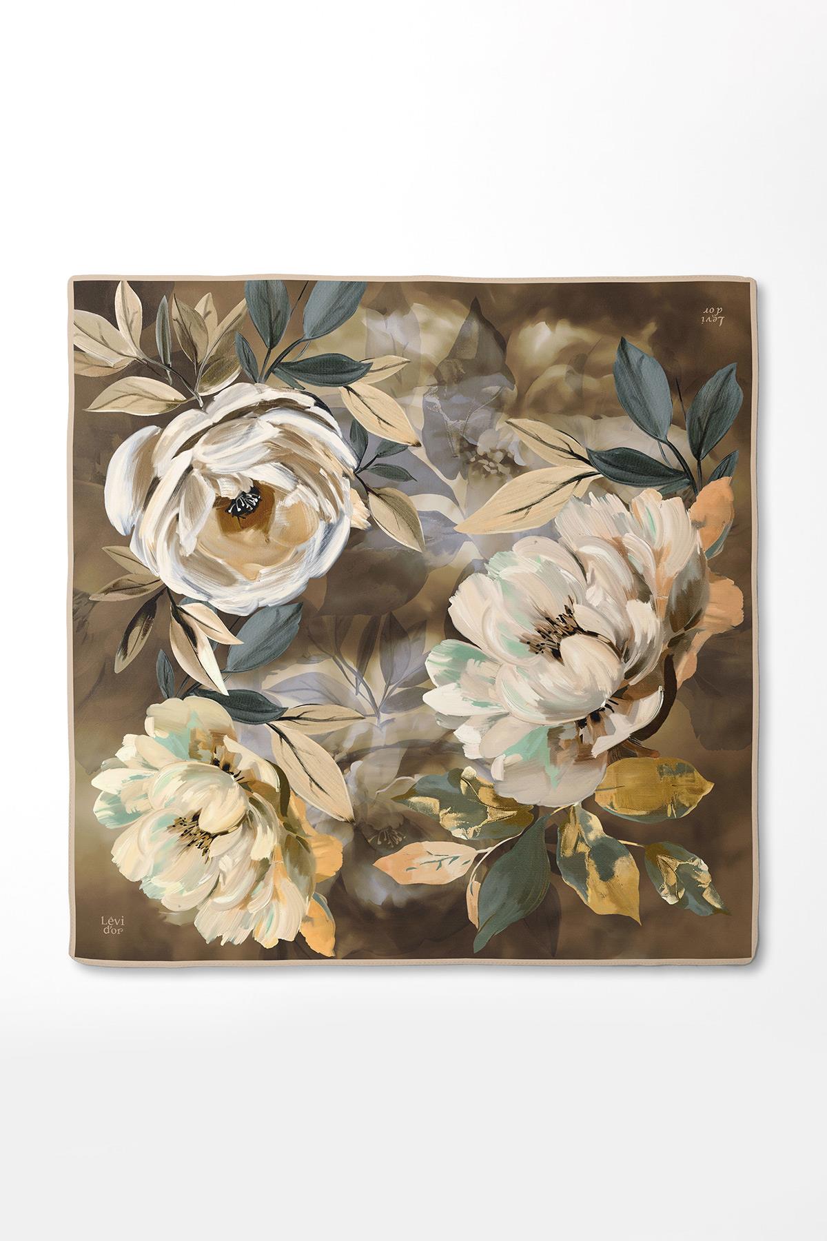 LevidorA.Kahve Çiçek Desenli Twill İpek Eşarp