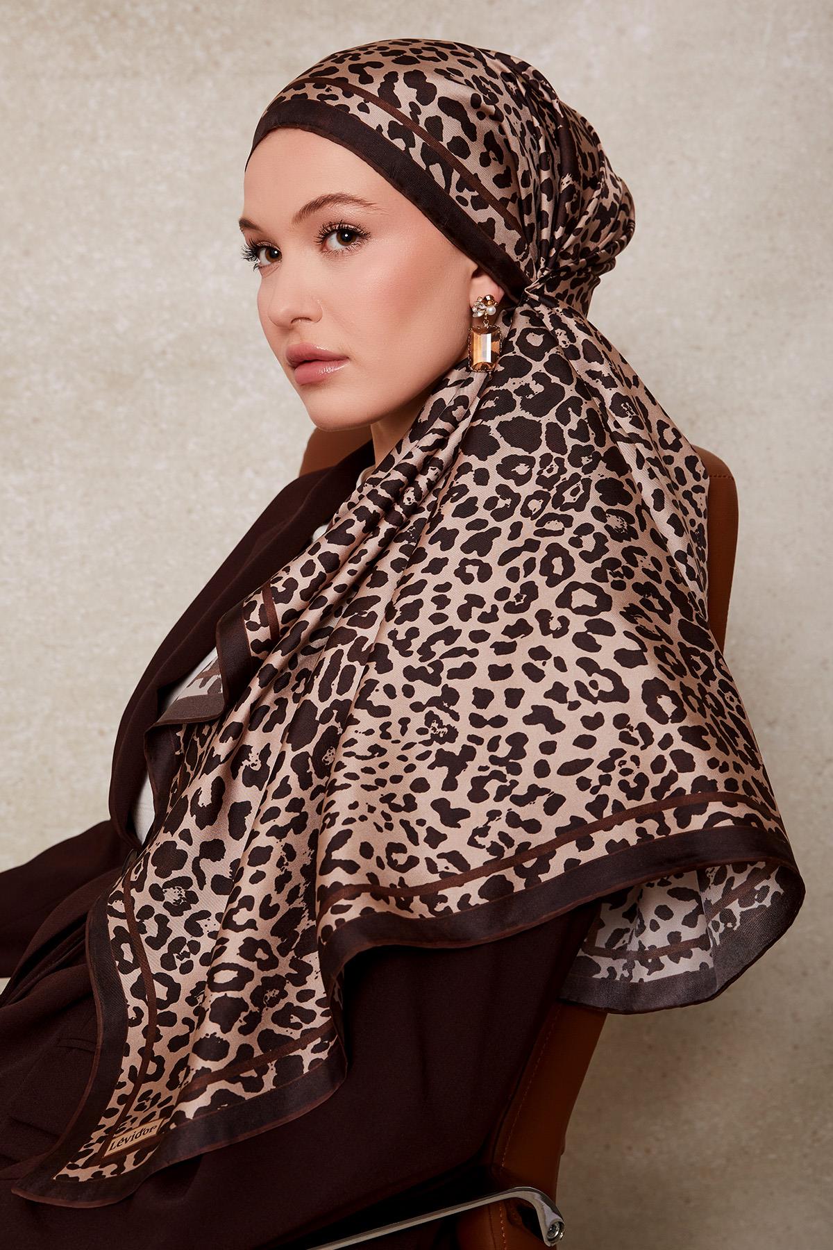 LevidorK.Kahve Leopar Desen Twill İpek Eşarp