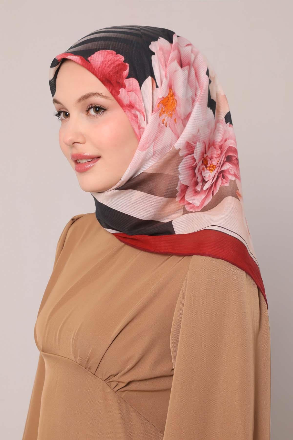 Kırmızı Çizgili Çiçek Desen Pamuk Eşarp (LVD.PME.0025)