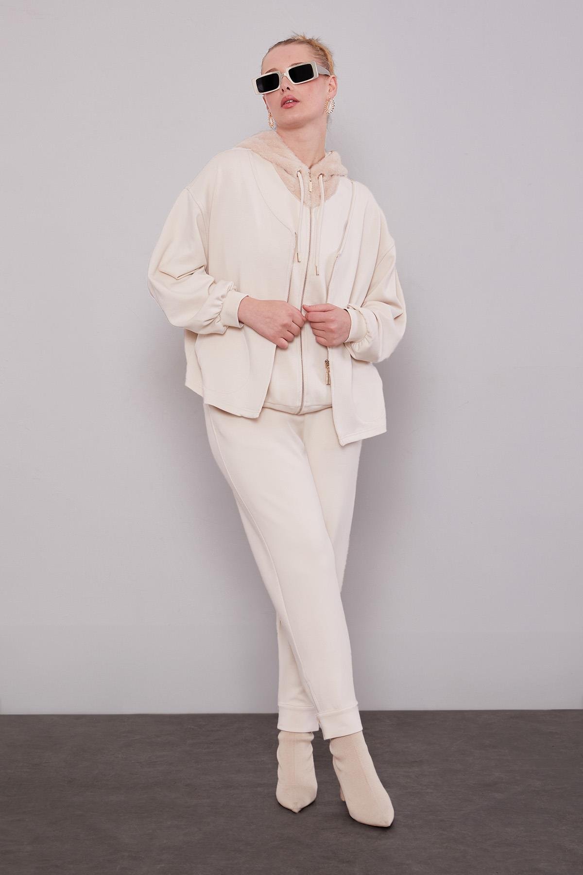 Krem Peluş Şapkalı İkili Takım (100901)