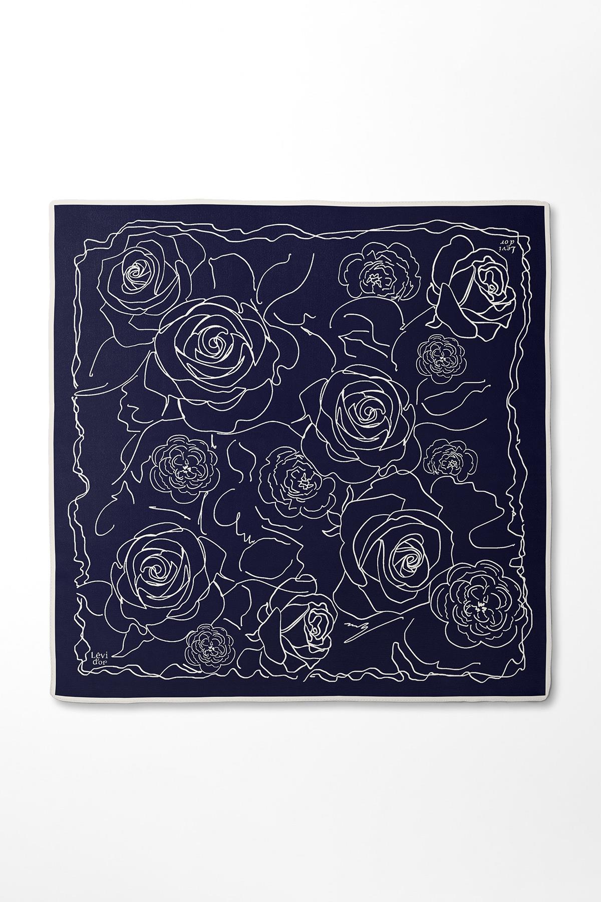 LevidorLacivert - Ekru Gül Desen Twill İpek Eşarp