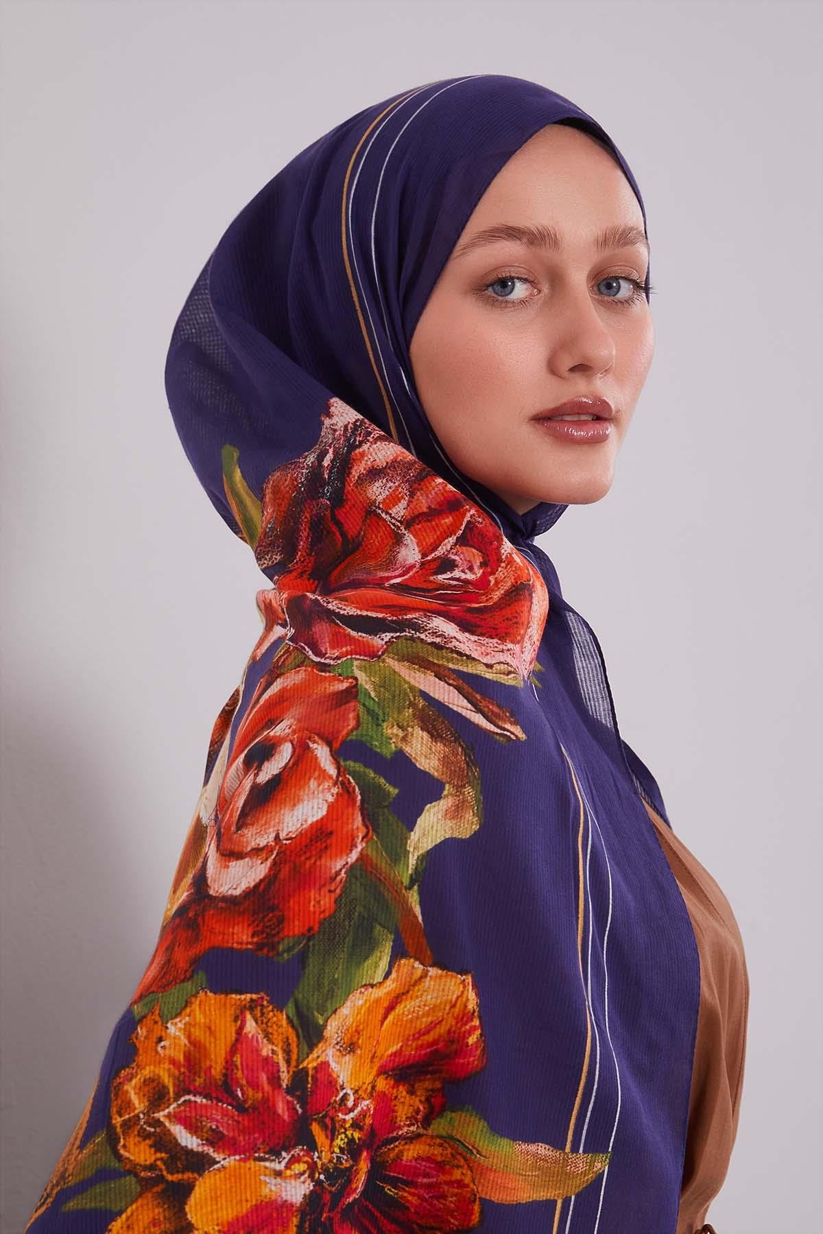 Lacivert Gül Desen Pamuk Şal (LVD.PMK.0205)
