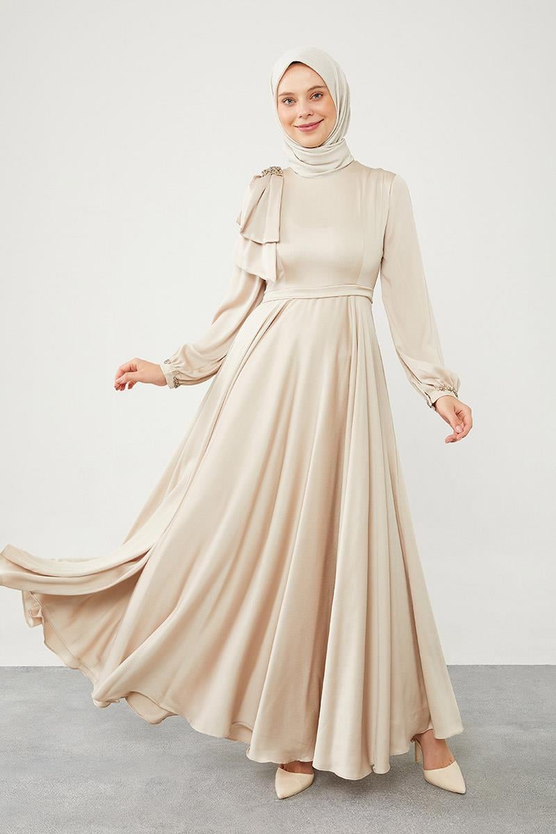 Bej Omuzu İşleme Detaylı Saten Elbise (LVFW2333004)