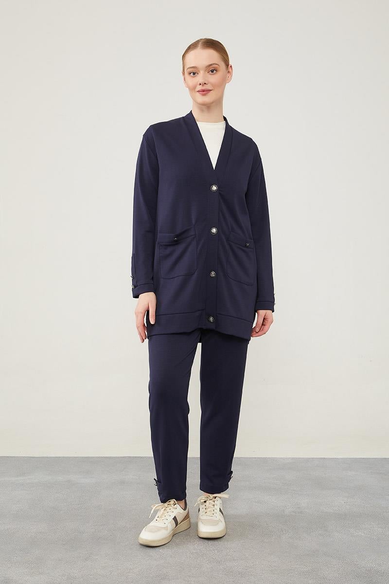 Ribanası düğme detaylı hırkalı takım kumaş özelliğiyle gün boyu konfor ve rahat hissetmenize olanak tanır. Mevsim geçişlerinde kullanım alanlarının çok yönlülüğü sayesinde gardrobunuzun vazgeçilmez parçasıdır. İkili takım avantajları saymakla bitmez. Hırkasını farklı etek modelleriyle de takım yapabilirsiniz. Düz renk ikili takım modellerini desenli ipek şal ile kombinleyerek stilinize hava katabilirsiniz.