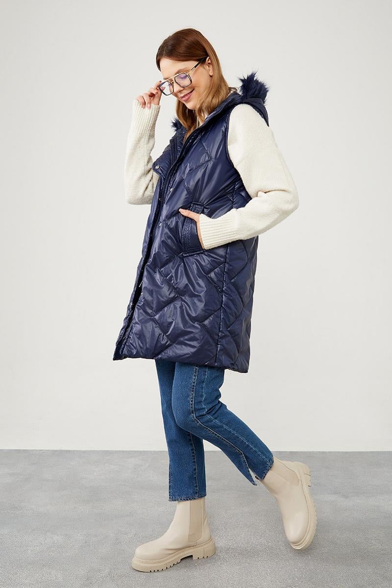 Lacivert Kapitone Kapüşonlu Çıtçıt Kapamalı Yelek (580008)
