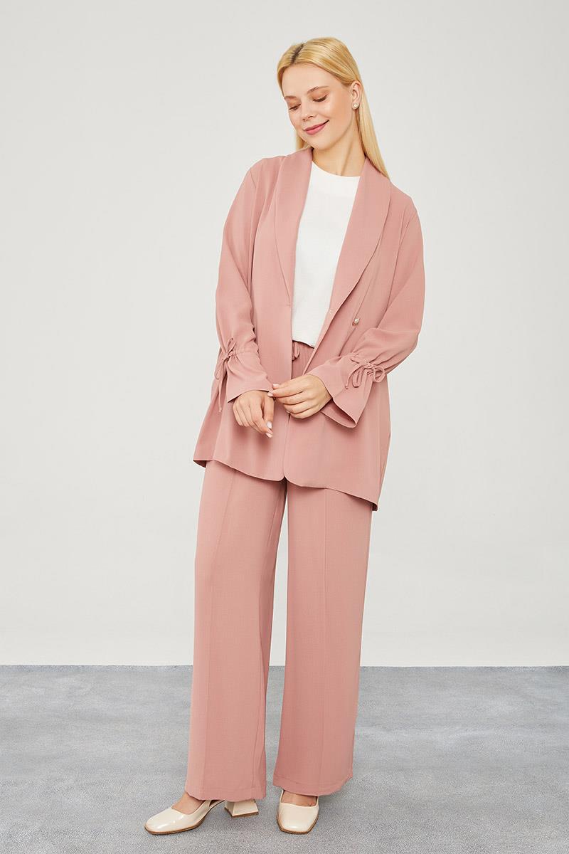Pudra Kolları Büzgü Detaylı Pantolonlu Takım (100060)