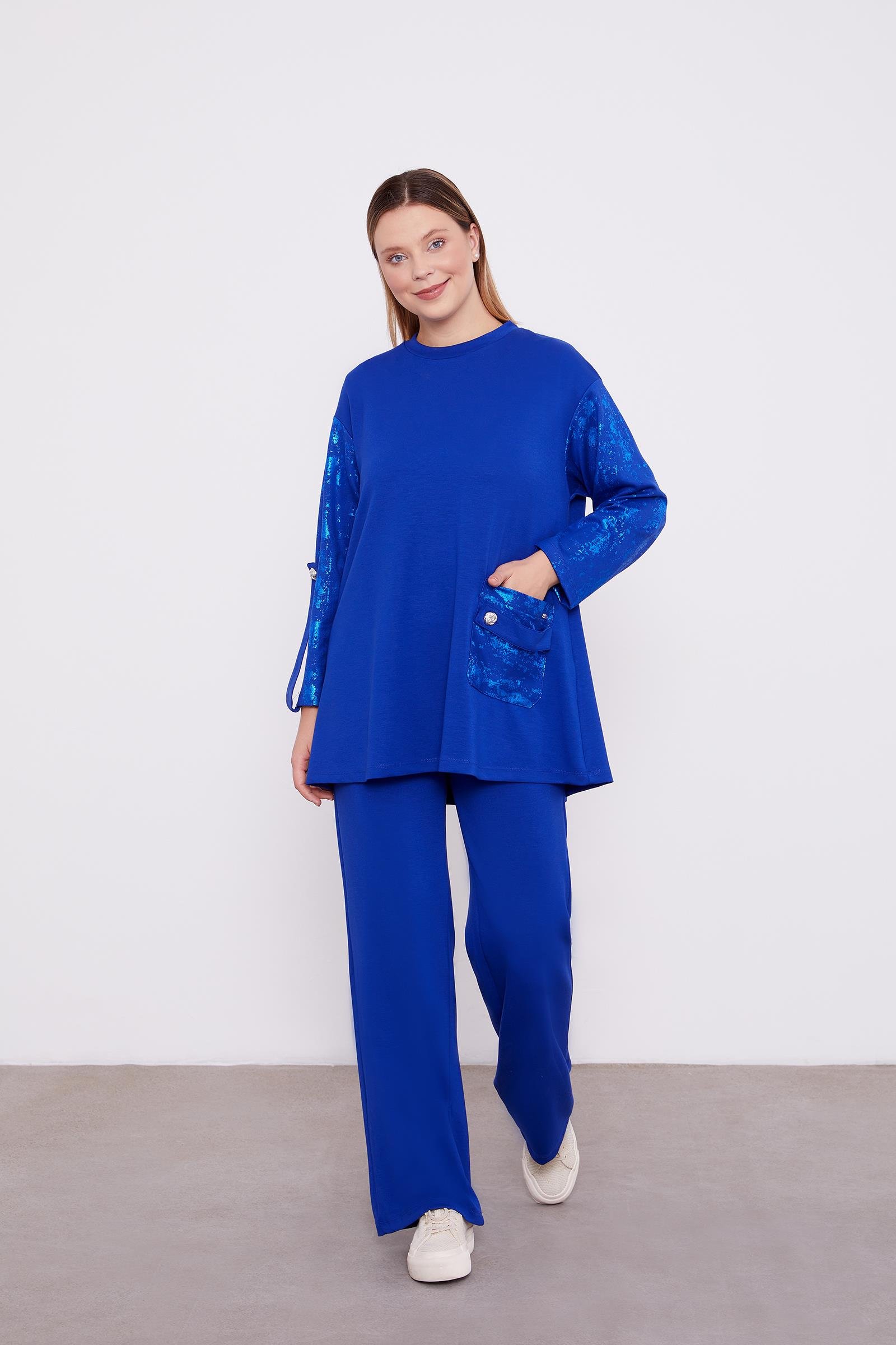 Varak detaylı spor takımın ışıltılı varaklı kumaşından oluşan üst parçası asil duruşuyla dikkat çekerken sade ve dökümlü alt parçası ile fark yaratıyor. Tuniğinde yer alan büyük cep detayı ve bisiklet yakası ile şıklığı fonksiyonellikle birleştiriyor. Pantolonun bol paçalı kesimi rahatlığın yanı sıra modern bir siluet sunuyor. Özel tasarım ikili takım hem gündüz hem gece davetlerinde şık görünmeyi hedefleyen zevk sahibi bayanlar için ideal bir seçimdir. Üst parçasını farklı pantolon veya etek modelleriyle de kombinleyerek birden fazla kombin oluşturabilirsiniz. Bu özel takımı topuklu ayakkabılarla kombinlediğinizde akşamlarında zarif bir görünüm elde edebilirsiniz. İkili bayan takımımızı Portföy çanta modelleri ile kombinleyerek stilinize hava katabilirsiniz.