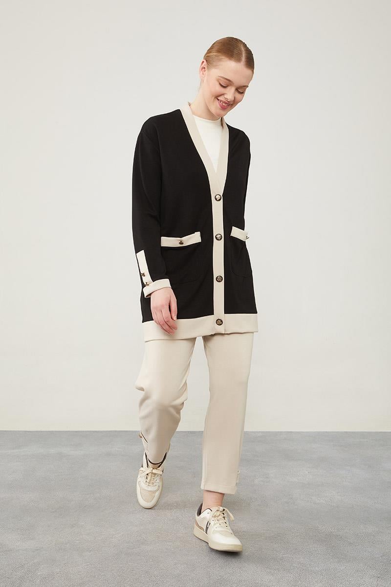 Siyah-Bej Ribanası Düğme Detaylı Hırkalı Takım (100265)
