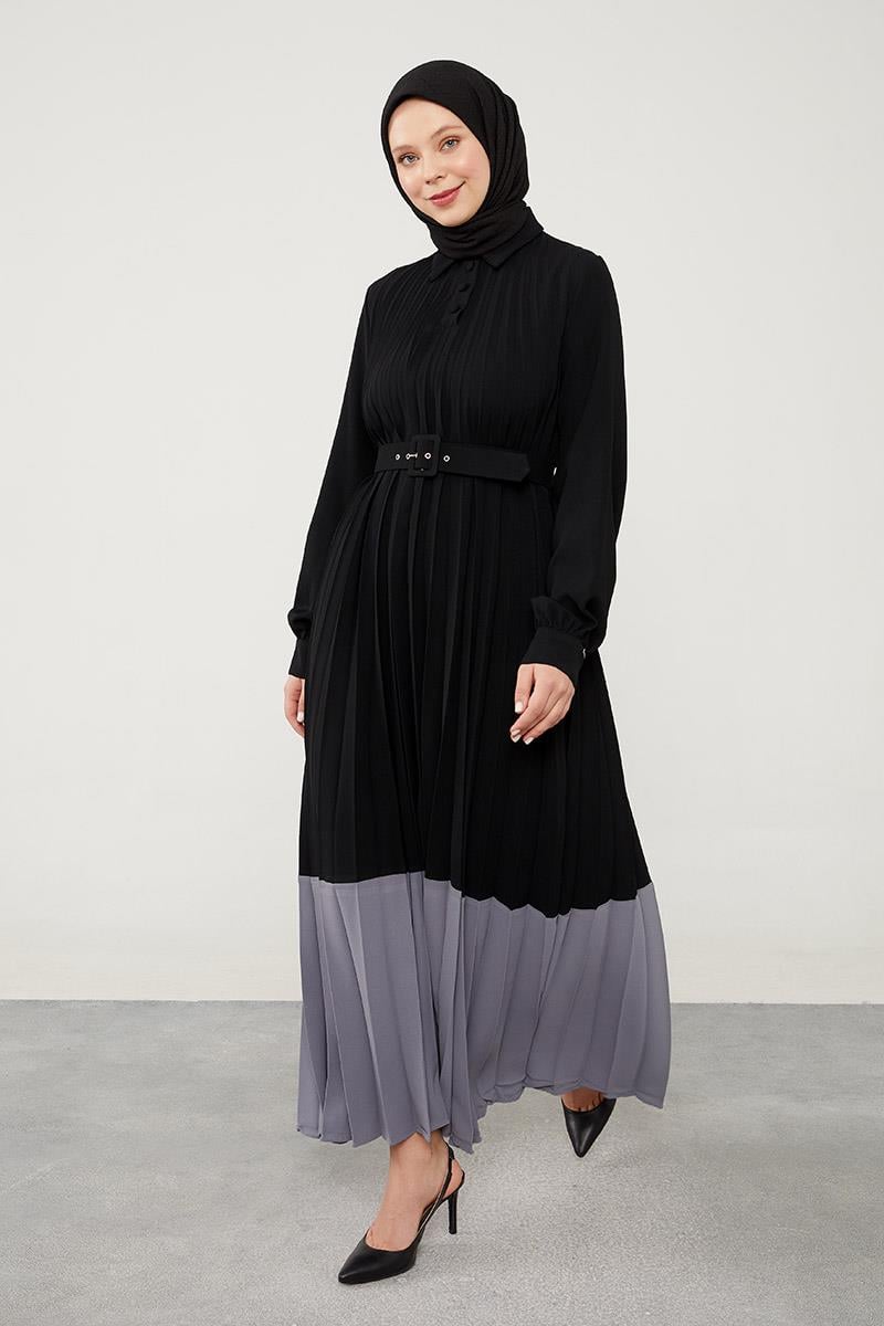 Siyah Pliseli Çift Renk Kemerli Elbise (330086)