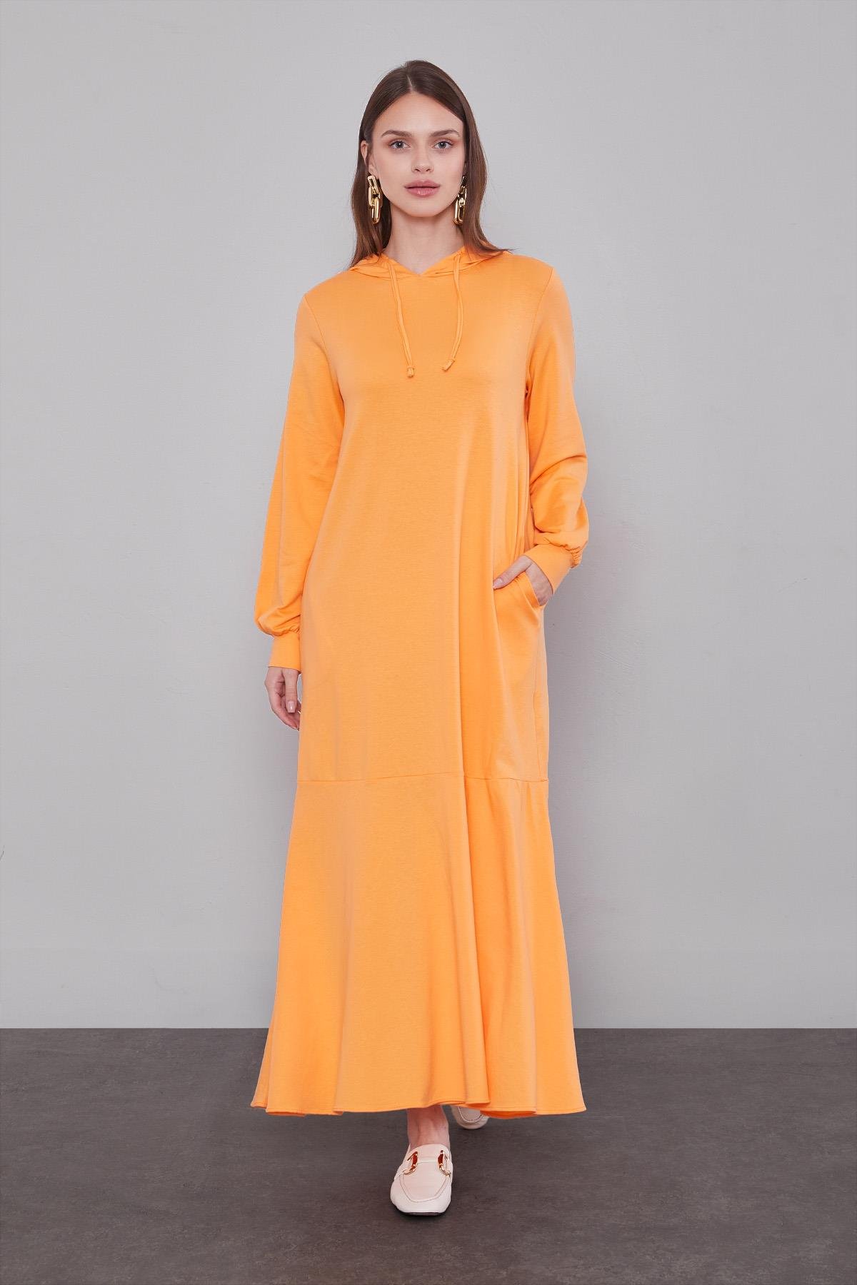 Kapüşonlu gizli cep detaylı elbisemizi royal şallarımızla tarzınıza hava katarak kullanabilirsiniz. Dört mevsim rahatlıkla tercih edebileceğiniz ürünümüz diz üstünde başlayan volan detaylarıyla şıklığınızı ön plana çıkarıyor.