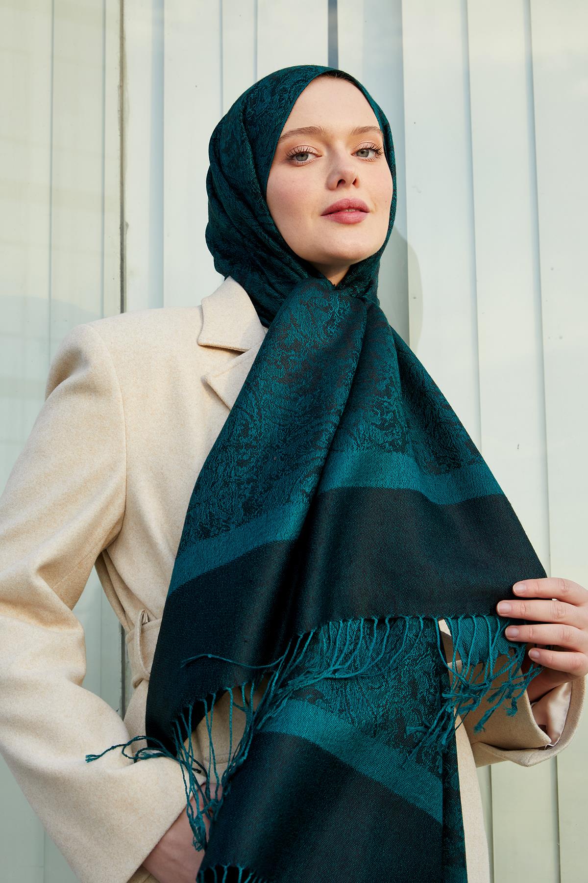 Zümrüt Püsküllü Etnik Kaşmir İpek Şal (LVD.IPS.0002)