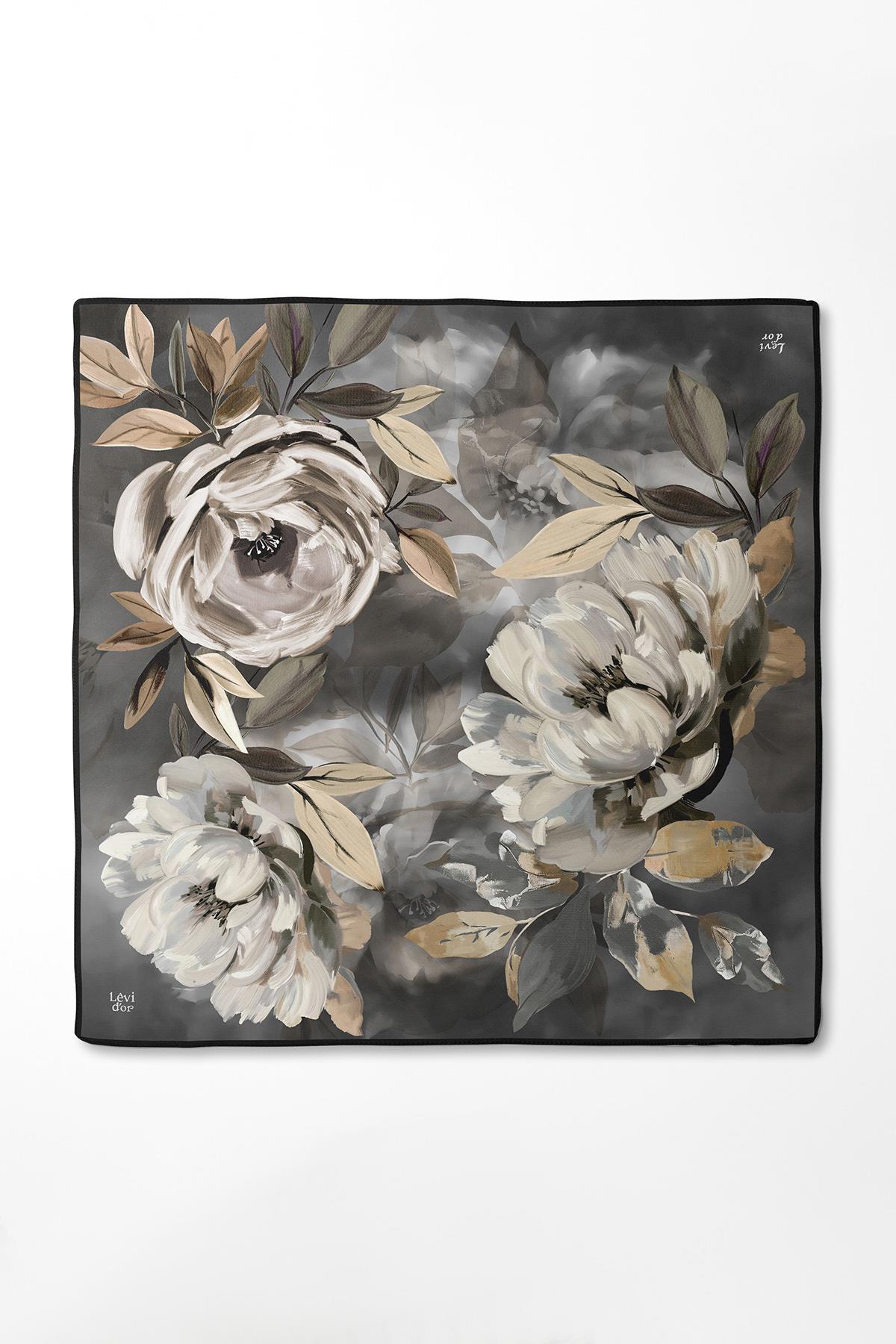 LevidorSiyah Çiçek Desenli Twill İpek Eşarp