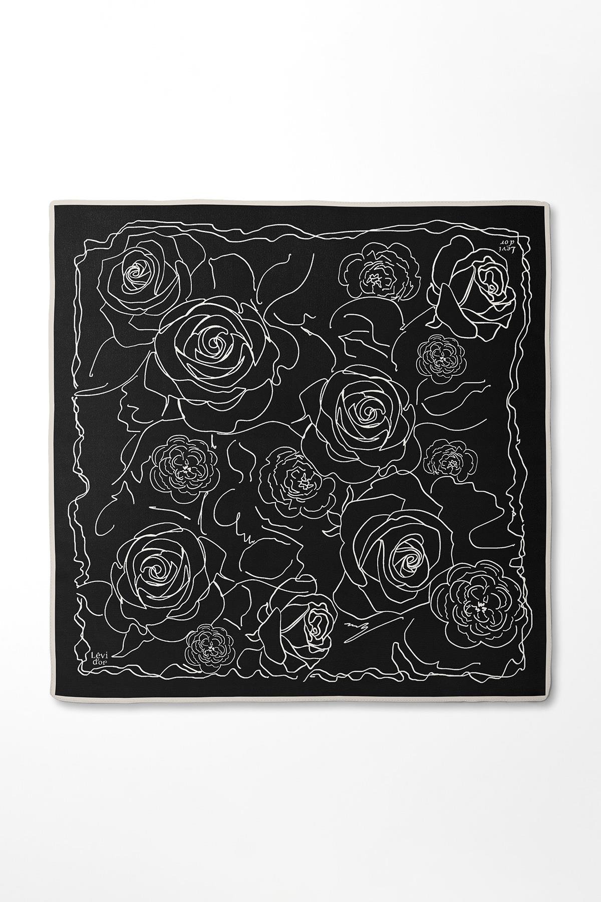 LevidorSiyah-Ekru Gül Desen Twill İpek Eşarp
