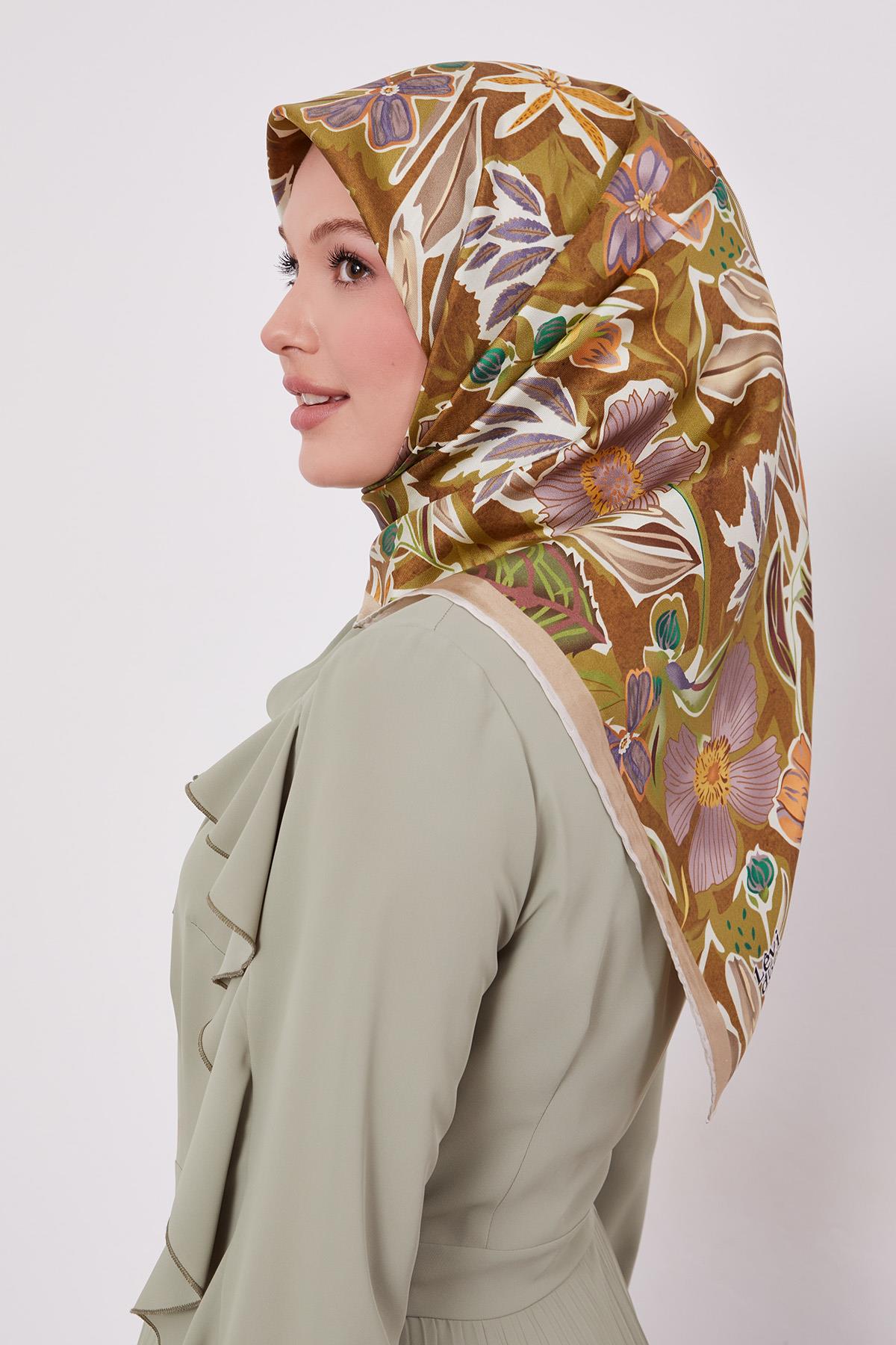 Yağ Yeşili Petunya Desen Twill İpek Eşarp (LVD.IPE.0897)