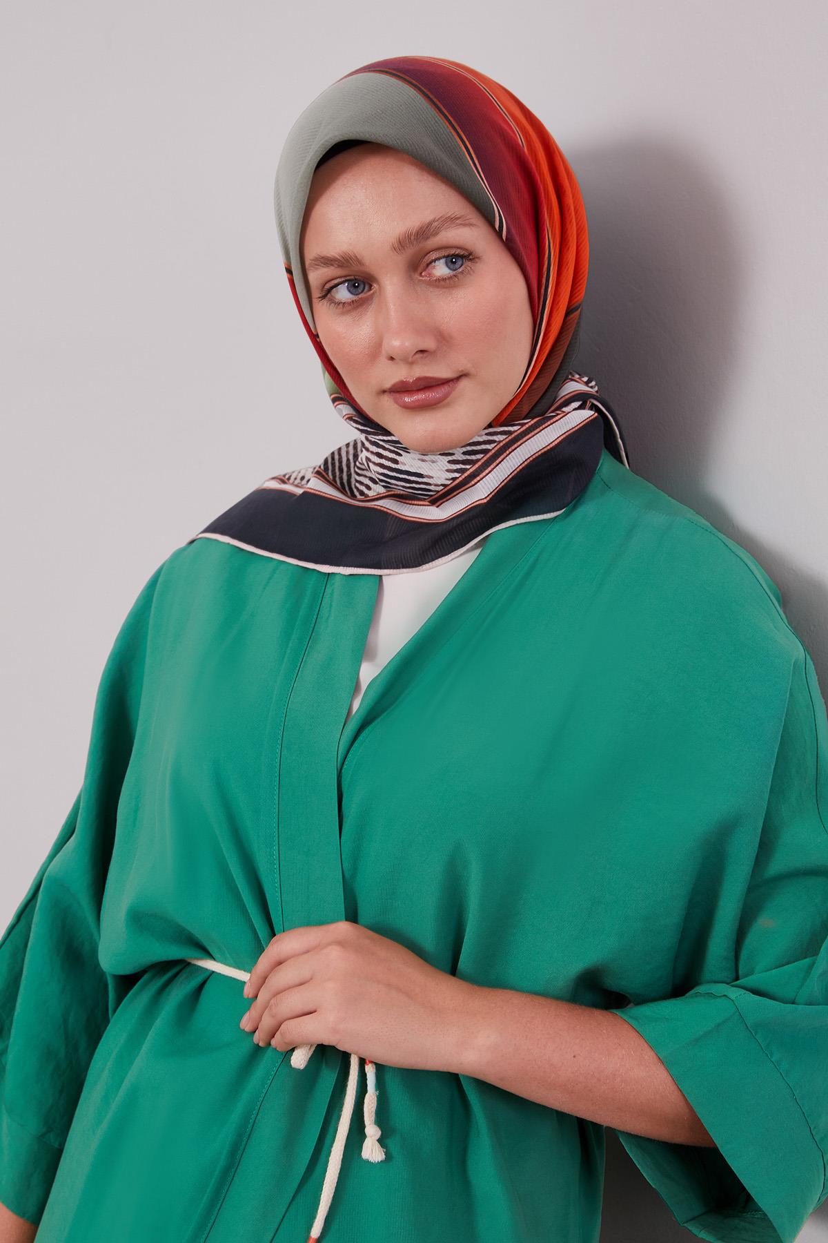 Şıklığınıza dinamizm katan eşsiz karışık geometrik desen pamuk eşarpgeometrik desenlerini özel pamuk dokusu ile bir araya getiriyor. Üstelik günlük etkinliklerden özel davetlere kadar geniş bir kullanım alanına sahiptir. Bu özel desenler modern bir hava yaratarak farklı stillere de uyum sağlıyor. Nefes alan kumaşıyla kayma yapmadan gün boyu şekli bozulmadan formunu koruyan yeni eşarp modelimiz beğeninize sunuluyor. Tesettür tunik veya kemerli trençkotlarınızın üzerine kullanarak profesyonel ve zarif bir imaj çizebilirsiniz.